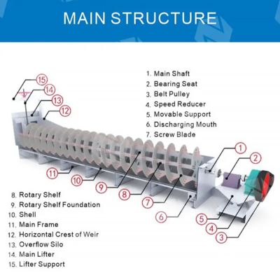 Professional design guide plates and adjustable long overflow weir boards, with optimized spiral speed to ensure the accuracy of material washing and grading; optimize the design drainage groove, effectively ensure that the washed materials are lost less, and the moisture in the material is removed to the maximum extent, and the sewage can be used in circulation.